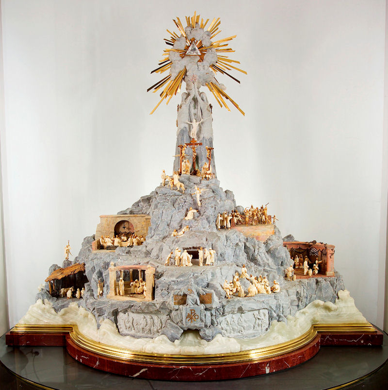 Techniquement cette pièce est une prouesse. Elle représente les épisodes les plus marquant de la vie du Christ au travers de scénettes animées par 138 personnages réalisés en or et en ivoire (des chryséléphantines). Elle mesure trois mètres de haut et pèse plus de trois tonnes. On retrouve sur l’avant de la pièce la vie de Jésus de la Nativité à la Résurrection, puis à l’arrière des symboles divers représentant la religion musulmane, l’hindouisme, le bouddhisme et les sept péchés capitaux. La pièce fut, un temps, pressentie pour rejoindre le trésor du Sacré-cœur mais au final, elle ne fut montrée que durant une vingtaine d’année et seulement dans un salon privé de la maison Chaumet. En 1993, elle est démontée ; en 2000, elle est classée Trésor National ; Enfin, elle est acquise par la ville de Paray-le-Monial en 2004. Est alors entreprit un énorme travail de restauration dont la restitution du système de rotation qui anime les personnages des différentes scénettes. Cependant, pour voir la Via Vitæ en mouvement, il faudra attendre les journées du patrimoine ou prendre rendez-vous au musée. J’ajoute enfin pour les amateurs de gemmes que l’hostie (symbolisant le corps du Christ et brandie pas deux figures féminines au sommet de la pièce) est sertie de rubis et de  diamants, enfin la pierre centrale est un cristal de roche taillé.