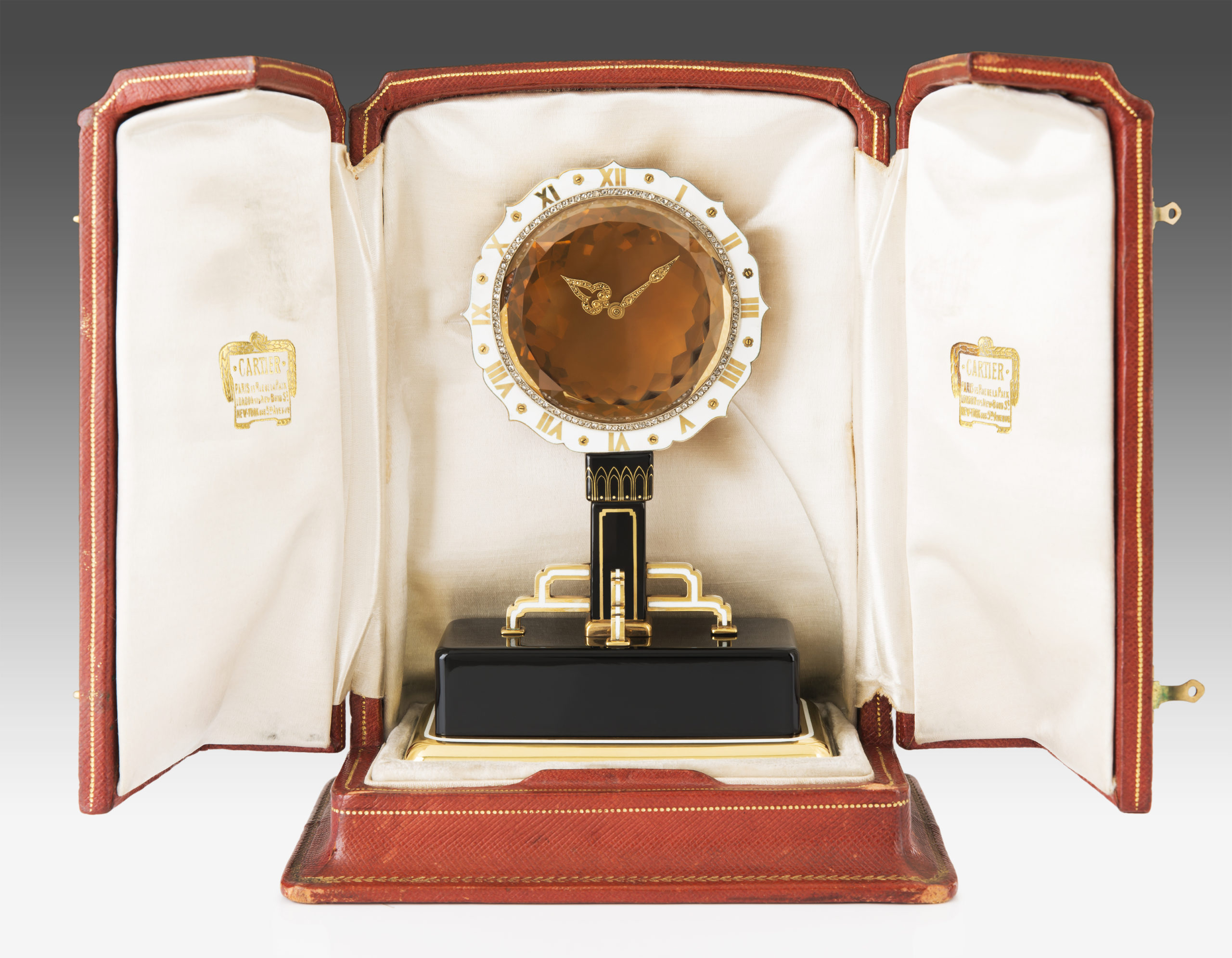La pendule dans son écrin signé de la maison Cartier. Photo : Mallié-Arcellin