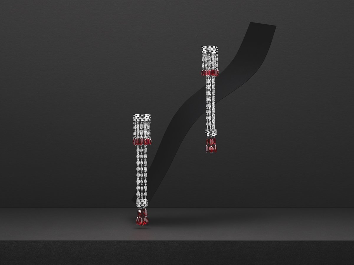 Boucles d’oreilles « Chandelier » en or, diamants et rubis du Mozambique pour 36 carats. Photo : Alexandre Reza