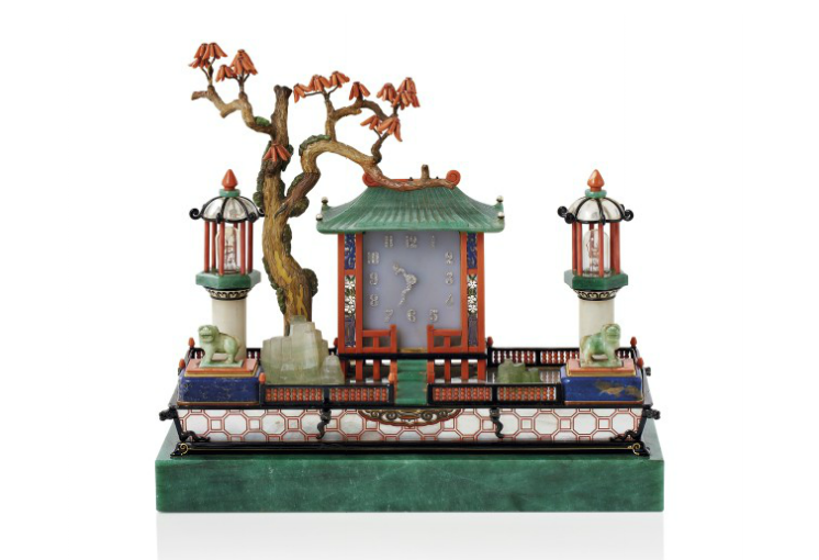Lot 19 : Nécessaire de bureau Cartier « Le jardin japonais » commandé par Anna Gould en 1926. La pagode de corail et de quartz aventuriné ponctué de perles et à décors d’émail polychrome abritant la pendulette en agate grise à chiffres arabes sertis de diamants, les aiguilles représentant un dragon pavé de diamants, le jardin en cristal de roche (fêlé), entouré d’une barrière en laque noire décorée de billes de corail (manques) et rehaussée de têtes de dragon dont deux servant à poser le porte-plume et rehaussée d’une mosaïque de nacre, décoré de rochers, de deux lanternes en quartz, quartz aventuriné, corail et émail noir abritant de petites ampoules (110 volts), d’un arbre ponctué de fleurs de corail, d’un ponton de quartz aventuriné et de corail et de deux sculptures de lions de Fo sur un socle de lapis-lazuli découvrant deux encriers, la base rectangulaire en quartz aventuriné, avec un porte-plume en lapis-lazuli, quartz aventuriné, onyx et corail fabriqué sur mesure par la Maison Cartier en 2017 (non illustré), dans son écrin cathédrale. Estimation entre 1 et 1,5 millions d’euros. Estimated between € 1-1,5 millions. Photo : Christie’s