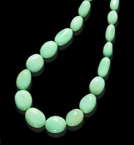 Lot 1145 : rare collier d’opale commune verte en provenance d’une poche trouvée au Kosovo pour un poids supérieur à 460 carats. Estimation entre 2500 et 3500 $. Photo : Bonhams