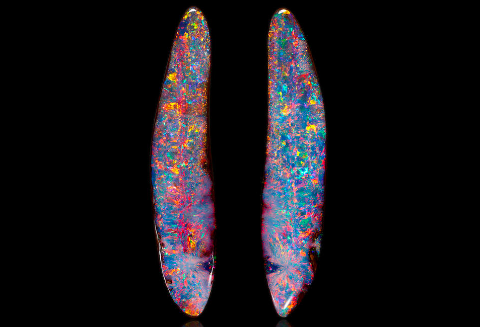 Lot 1097 : rare appairage de deux opales australiennes (Queensland) pour 129 carats environ. Estimation entre 50,000 et 70,000$. Photo : Bonhams