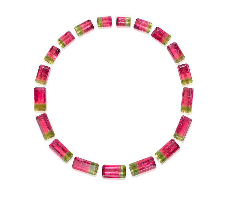Lot 2352 : rare et important ensemble de 19 tourmalines bicolores en provenant de la Himalayan Mine (Pala, Californie) et pesant 219,5 carats. Estimation entre 17,000 et 22,000 $. Photo : Bonhams