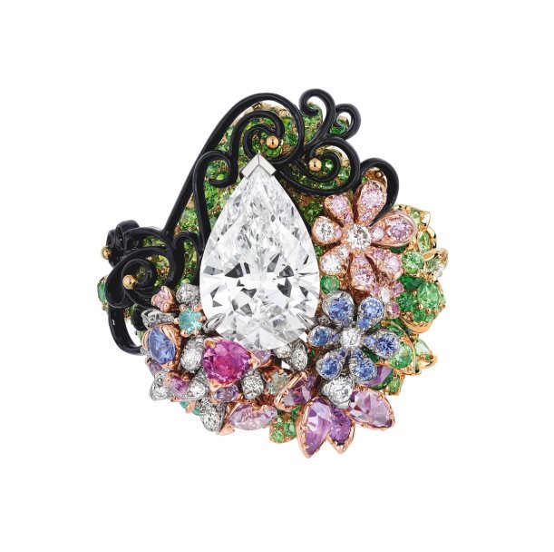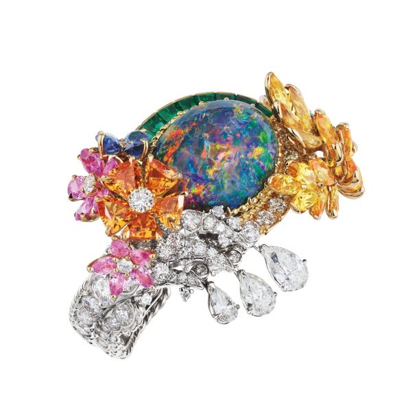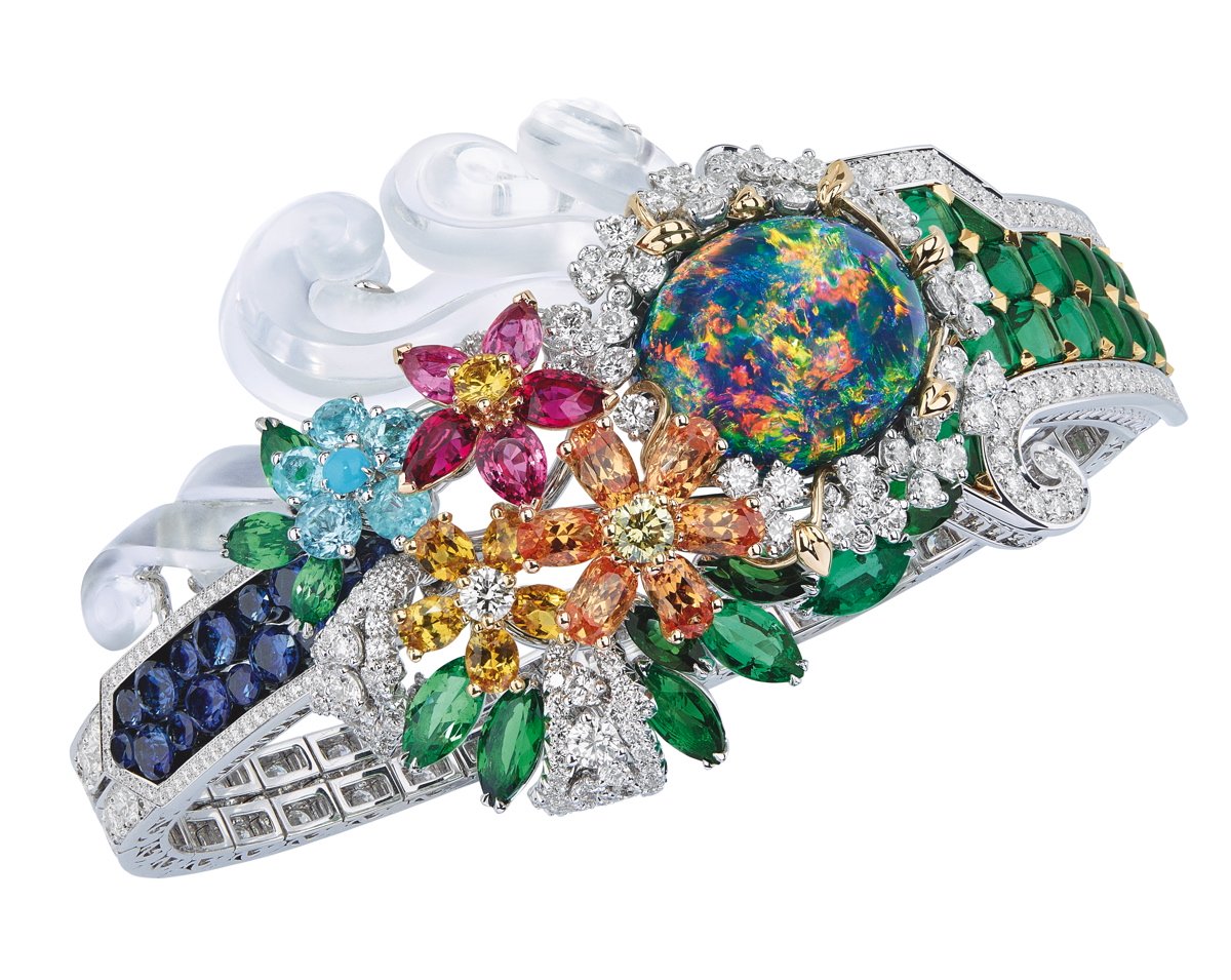 Bracelet « Bosquet de l’Encelade », or blanc, rose et jaune, diamants incolores et jaunes, cristal de roche, opale noire, émeraudes, grenats (spessartites et tsavorites), spinelles roses et rouges, saphirs (bleus et jaunes), tourmaline de type Paraïba. Photo : Dior Joaillerie