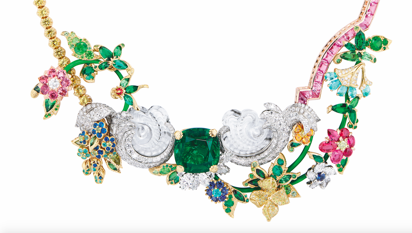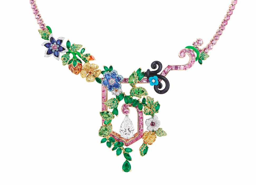 Collier « Bosquet de la salle de bal », or jaune, blanc et rose, platine, diamants, cristal de roche, émeraudes, saphirs roses et jaunes, grenats tsavorites et démantoïdes, tourmalines de type Paraïba, spinelles roses, saphirs, diamants jaunes, haüynes, grenats spessartites et péridots. Photo : Dior Joaillerie