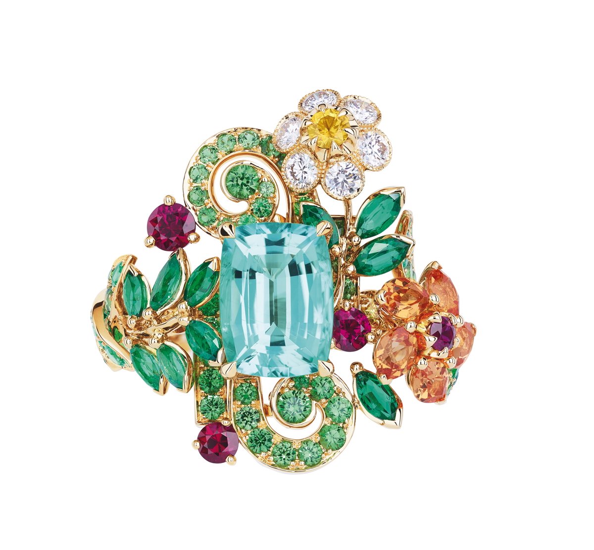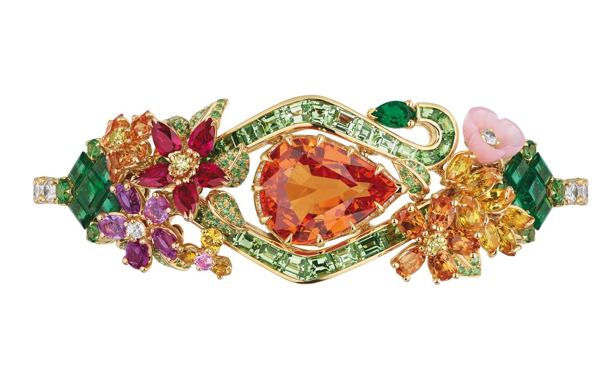 Bracelet « Bosquet de la salle de bal », or jaune, diamants, cristal de roche, émeraudes, rubis, saphirs (roses, violets, jaunes et bleus),  grenats (hessonites, tsavorites et démantoides), diamants jaunes, turquoise et laque.Photo : Dior Joaillerie