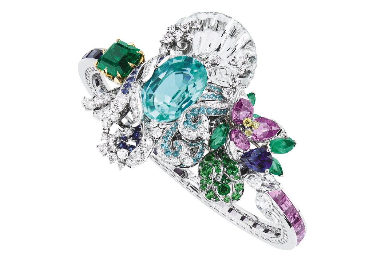 Bracelet « Bassin des nymphes », or blanc et jaune, diamants incolores et jaunes, tourmaline de type Paraïba, cristal de roche, saphirs (bleus, roses et violets), émeraudes, grenats tsavorites. Photo : Dior Joaillerie