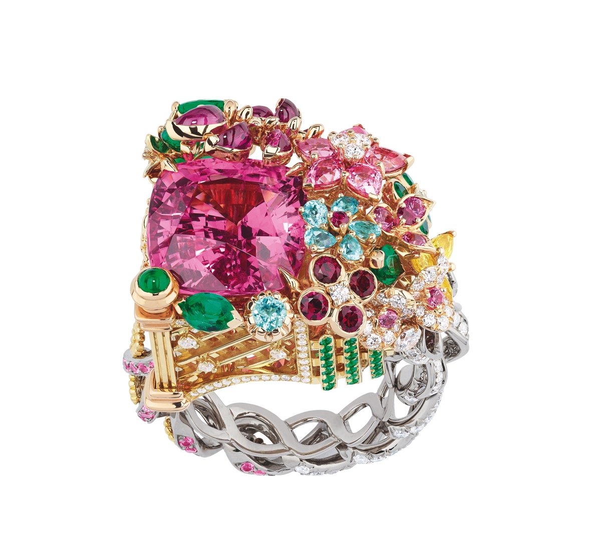 Bague « Hameau de la Reine », or jaune, rose et blanc, diamants, spinelles roses, saphirs roses et jaunes, tourmaline de type Paraïba, rubis. Photo : Dior Joaillerie