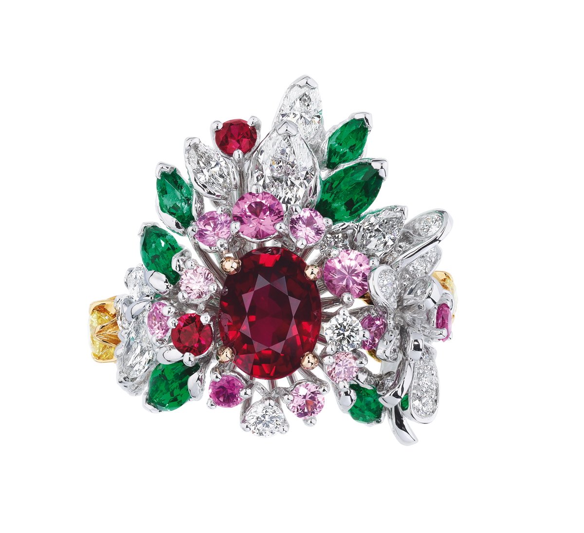 Bague « Couronne de fleurs » en or jaune, blanc et rose, rubis, émeraudes, saphirs roses, diamants incolores, roses et jaunes. Photo : Dior Joaillerie