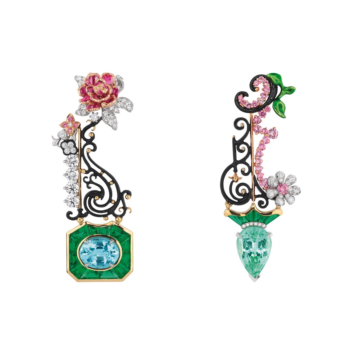 Boucles d’oreilles « Bosquet de la Reine », or blanc, jaune et rose, diamants, tourmaline de type Paraïba, émeraudes, saphirs roses et laque. Photo : Dior Joaillerie