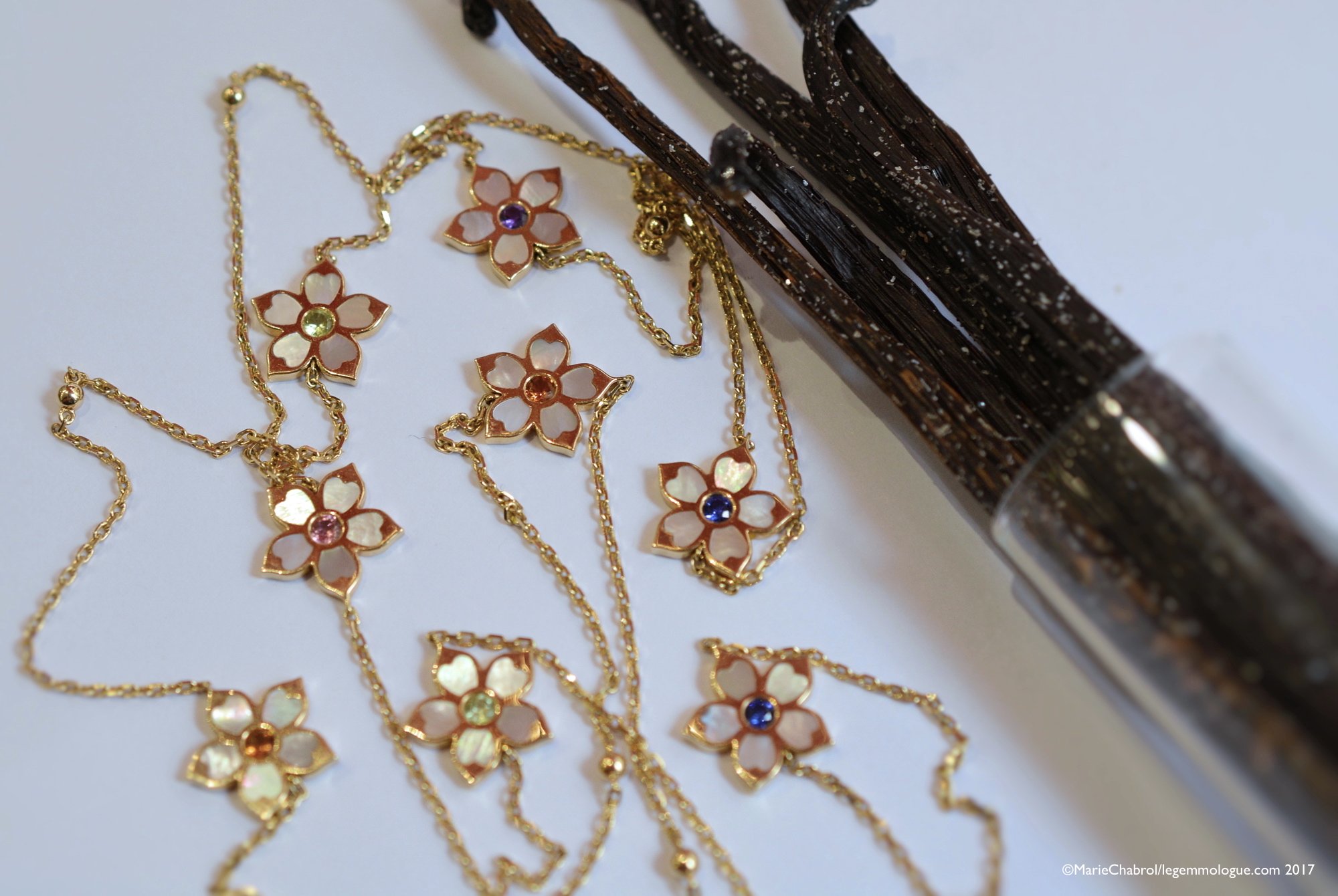 • La Vanille Vanilla offre une gamme en or jaune ou rose dans laquelle s’inscrivent des motifs en nacre selon les techniques italiennes de la scagliola qui incruste du stuc (parfois coloré) dans des meubles et de la pietra dura qui incruste des pierres dures créant des marqueteries remarquables