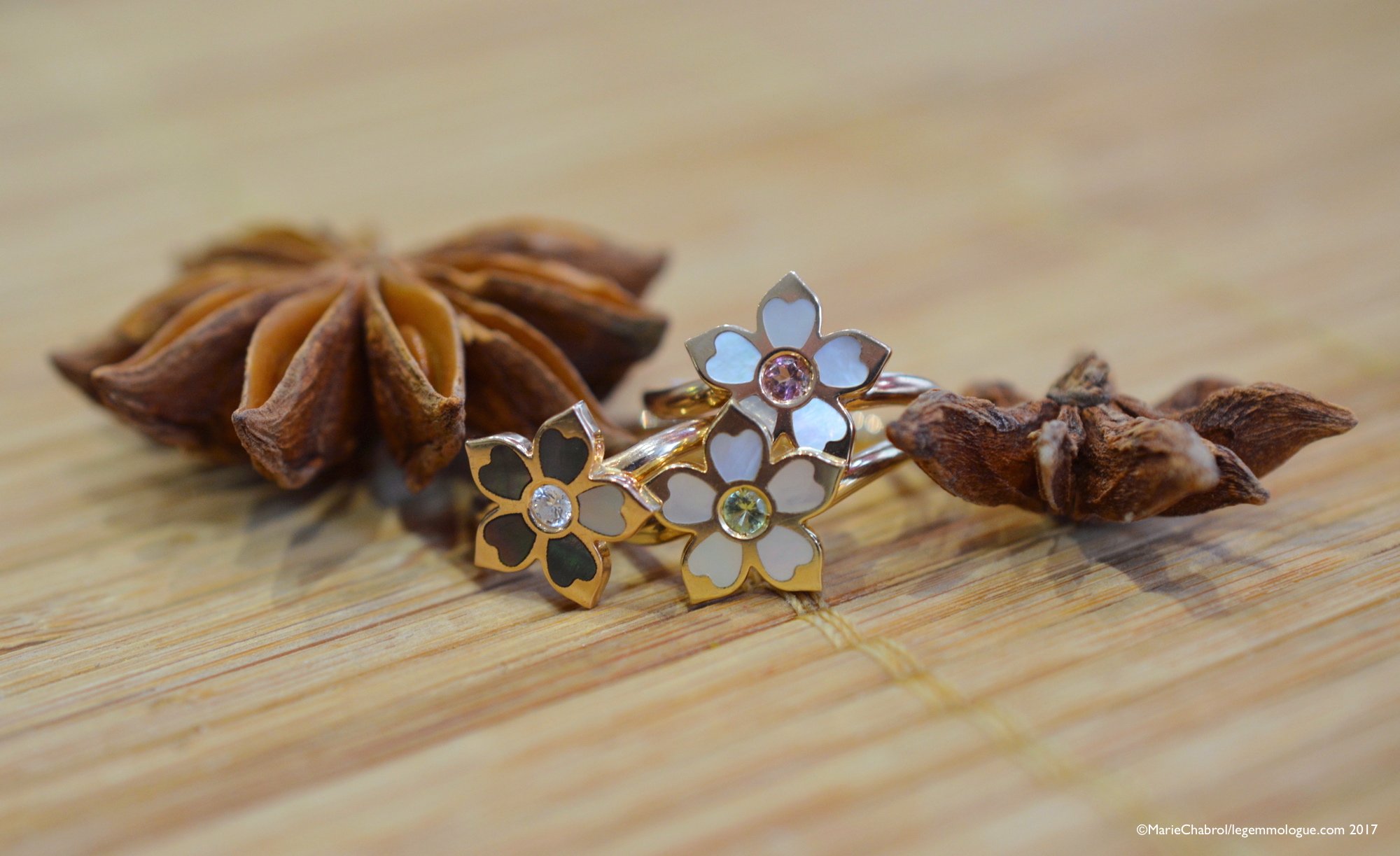 Bagues Vanilla en or jaune, diamant, péridot, tourmaline rose et nacre. Photo : ©MarieChabrol / legemmologue.com