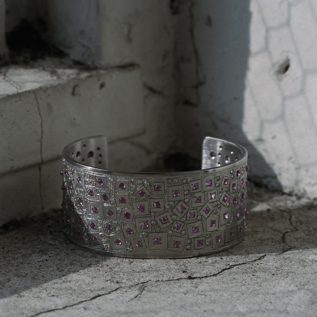 Bracelet en acier, diamants et saphirs roses. Photography by Wesley Stringer