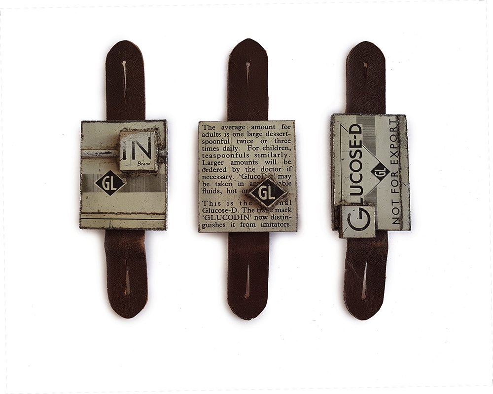 Née dans le quartier de Chiswick à Londres, Jo Pond est une artiste, créatrice de bijoux contemporains. D’abord initiée à l’art du bijou aux Berkshire and Loughborough Colleges of Art & Design, c’est lors de son Master à l’école de bijouterie de Birmingham, qu’elle pose les bases de sa pratique actuelle. Les œuvres de Jo Pond peuvent être considérées comme des objets réincarnés, des reliques du quotidien. Broche issue de l’ensemble GLAXO TIN, un set de sept broches, 2017. Boîte en acier recyclée, acier, fer, cuir, pierres nes, argent, celluloïde, os. Photo : Jo Pond