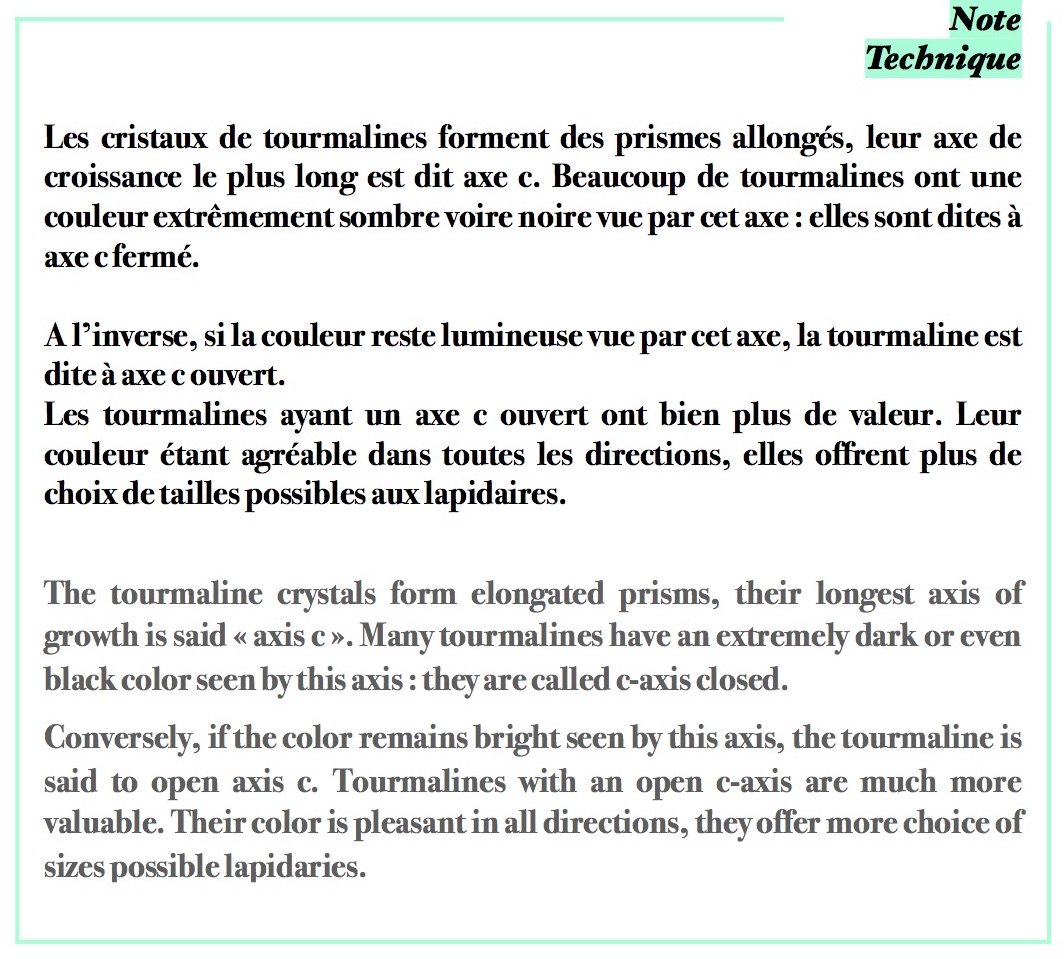 La production plutôt confidentielle de Namibie peut être également vu sous un jour positif. Cela peut paraitre paradoxal au premier abord, mais le faible nombre d’acteurs, de l’extraction même aux compagnies travaillant avec cette matière, rend les tourmalines Namibiennes facilement traçables de la mine au marché. Avec la forte tendance actuelle de recherche de traçabilité et d’éthique dans le domaine de la joaillerie, cela représente un atout par rapport aux tourmalines d’autres origines pouvant avoir des couleurs similaires.