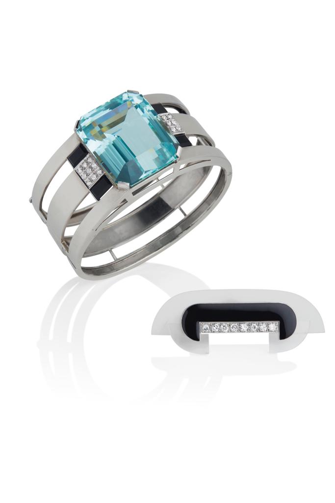 Les lots 63 et 64 sont de très beaux bijoux de type Art Déco. Le premier est un bracelet en or, diamants, onyx et aigue-marine dans un écrin de forme Fouquet. Son estimation va de 20,000 à 40,000 €. La broche est signée de Raymond Templier, elle est en or, cristal de roche, émail et diamants. Son estimation va de 6000 à 8000 €. Photo : Christie’s
