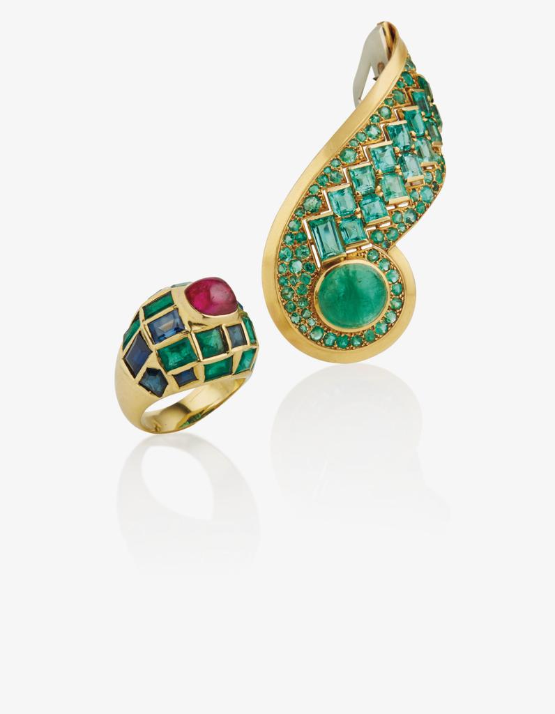 Les lots 251 et 252 montrent combien la couleur était importante chez René Boivin et Suzanne Belperron. La bague en or, rubis, saphirs et émeraudes (Belperron) est estimée entre 15,000 et 20,000 €. La broche Boivin en or et émeraude est, elle, estimée entre 20,000 et 30,000 €. Photo : Christie’s