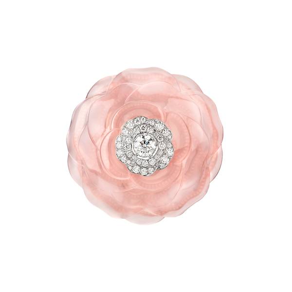 6- Je retiendrai chez Chanel la Broche QUINTESSENCE en or blanc, or rose, quartz rose sculpté et diamants. J’ai aimé le travail de sculpture mais également le jeu de transparence entre le quartz et la monture sertie de diamants. Photo : Chanel Joaillerie