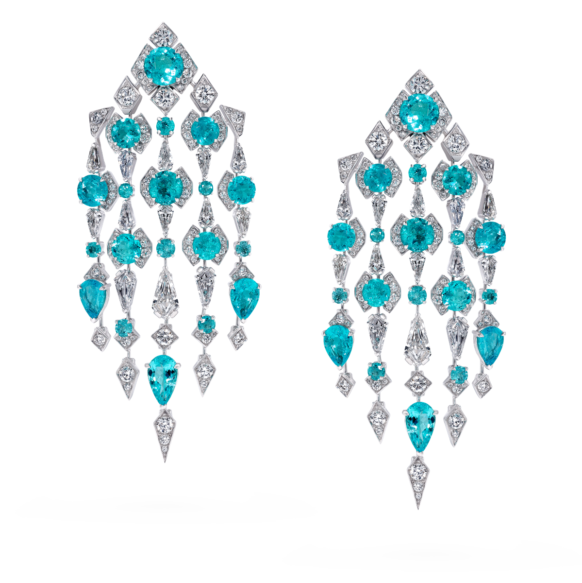 Boucles d’oreilles cascade en diamants blancs 11,02 carats, tourmaline brésilienne Paraiba 18,21 carats, en or blanc. Photo : David Morris