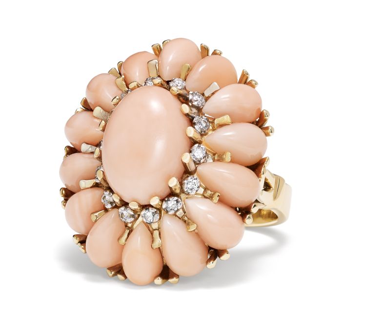 Une bague en or jaune, corail rose et diamant de la collection William & Son Vintage Edit