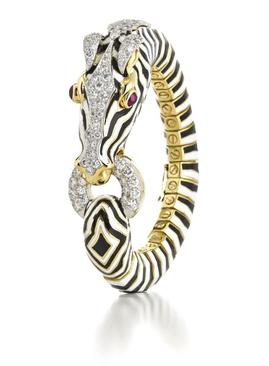 Bracelet David Webb « Zebra » en or, platine, diamants, émail, 1963. Désormais en exposition au Met Museum de New York.