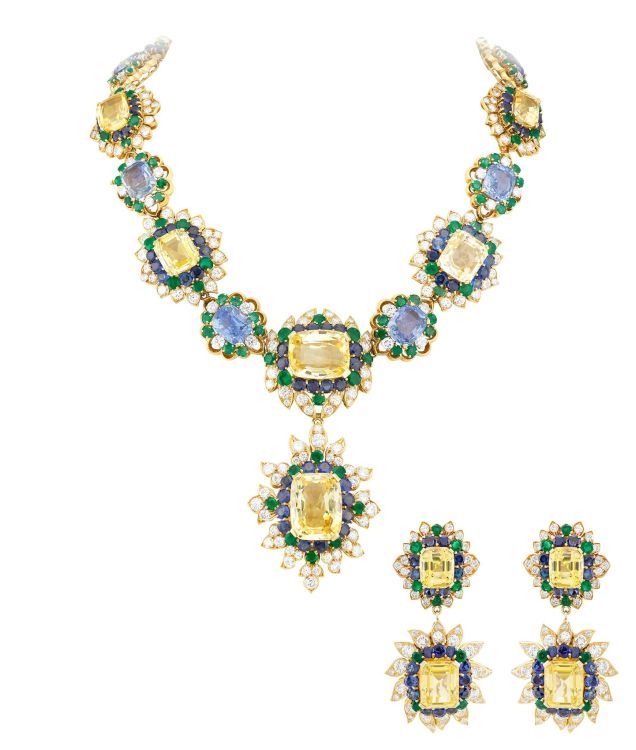 Parure Van Cleef & Arpels avec boucles d’oreilles et collier en or jaune, diamants, saphirs bleus et jaunes et émeraudes, 1959.