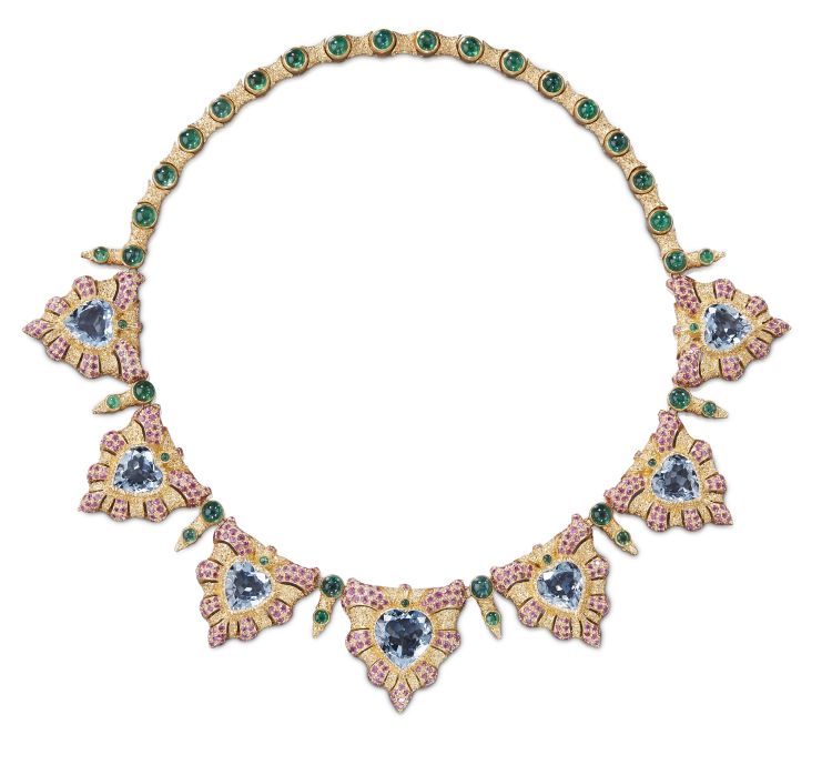 Collier Buccellati en or jaune avec émeraudes, saphirs roses et aigues-marines, 1992. Vendu pour plus de 52,000 € chez Sotheby’s Paris.
