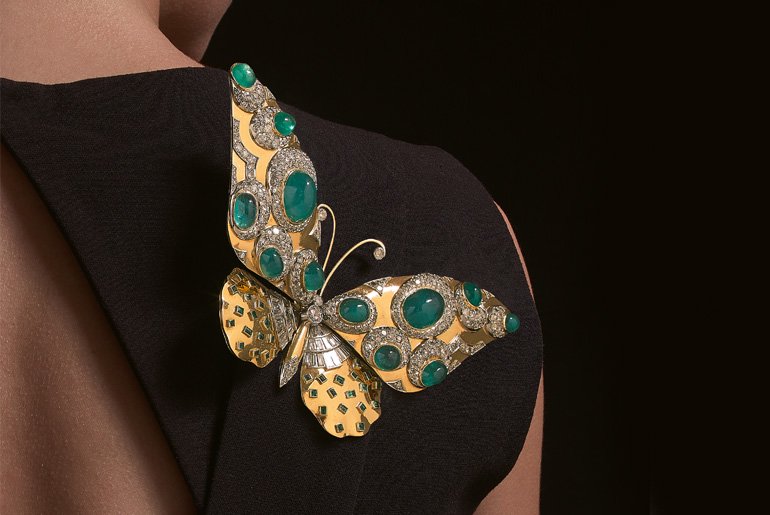 Une rare broche papillon Belperron en or, platine, diamants et émeraudes des années 40. Vendu par Aguttes en juin 2018 pour plus de 300 000 € contre une estimation de environ 30 000-50 000 €. Photo : Olivier Baroin / Aguttes.