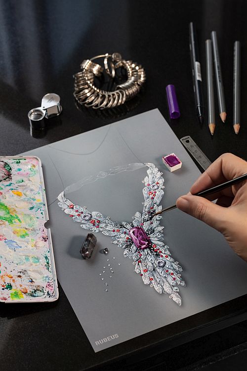Les opales et les alexandrites comptent parmi mes pierres préférées. J’ai eu la chance que les collectionneurs et fondateurs de Rubeus Milano – Nataliya et Viktor Bondarenko – m’invitent à créer une collection complète autour des alexandrites les plus importantes et les plus rares du monde. L’alexandrite de Russie est une pierre au changement de couleur extrêmement marqué et recherché, passant naturellement du vert à la lumière du jour au violet sous une lumière incandescente.