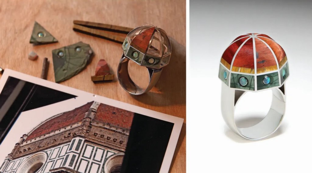 La bague « Duomo » inspiré du dôme de Brunelleschi de la Santa Maria del Fiori. Fabriqué en argent, incrusté d’œil de fer, d’œil de tigre, jaspe vert impérial et opale australienne. 2012, Collection privée. Photo : Valerie Jo Coulson