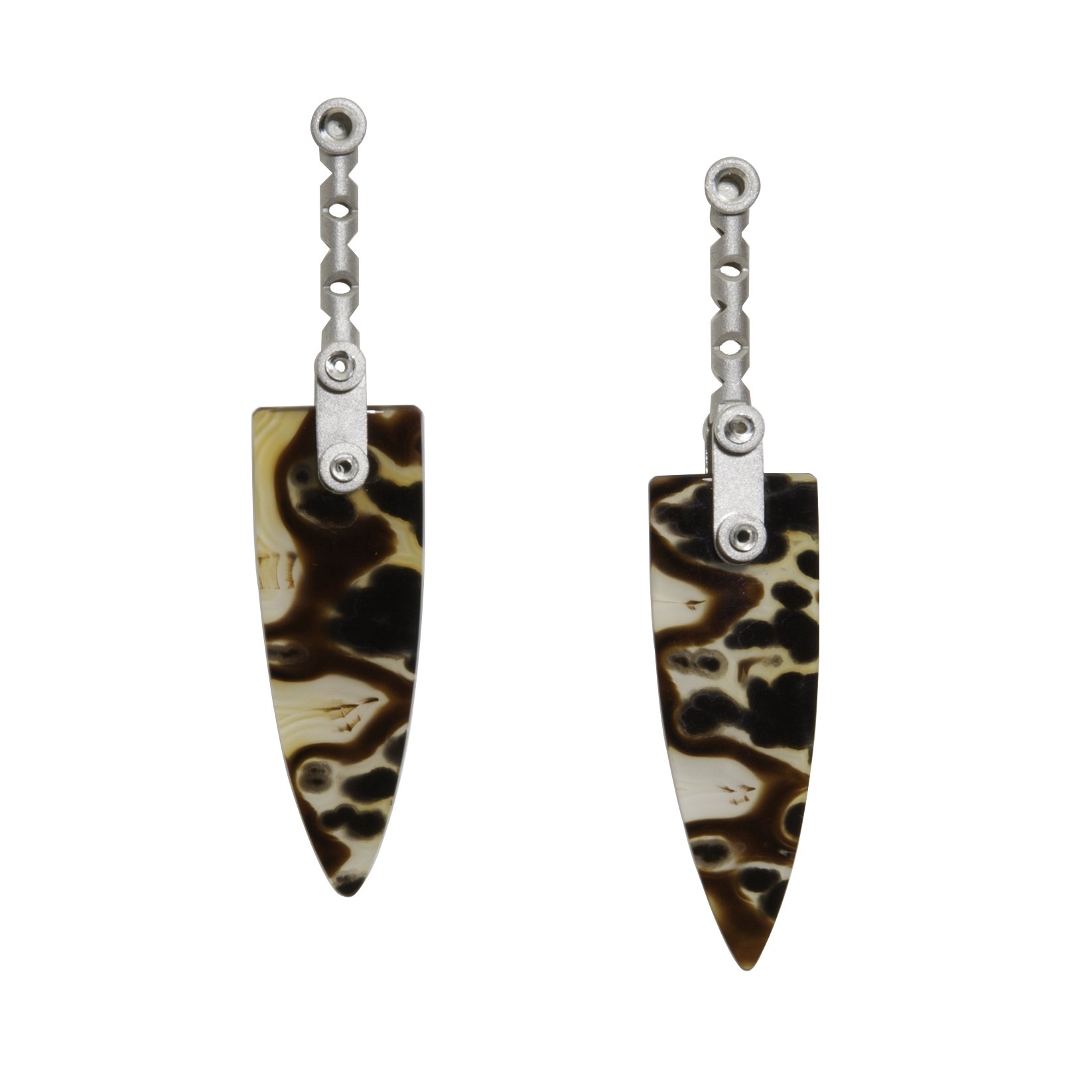 Boucles d’oreilles « Regeneration » #1. Argent, Piraha Agate. « Regeneration ». Photo : Valerie Jo Coulson