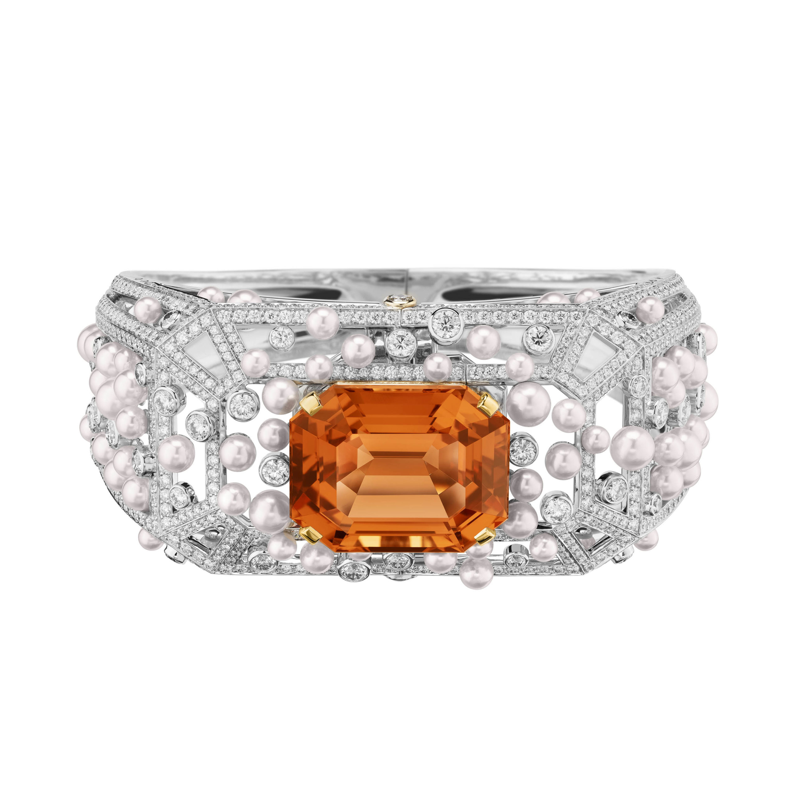 Bracelet BUBBLY STOPPER en or blanc, or jaune, diamants, topaze impériale et perles de culture. 1 topaze impériale taille émeraude 47,06 cts. Photo: Chanel Joaillerie