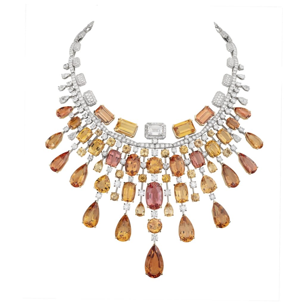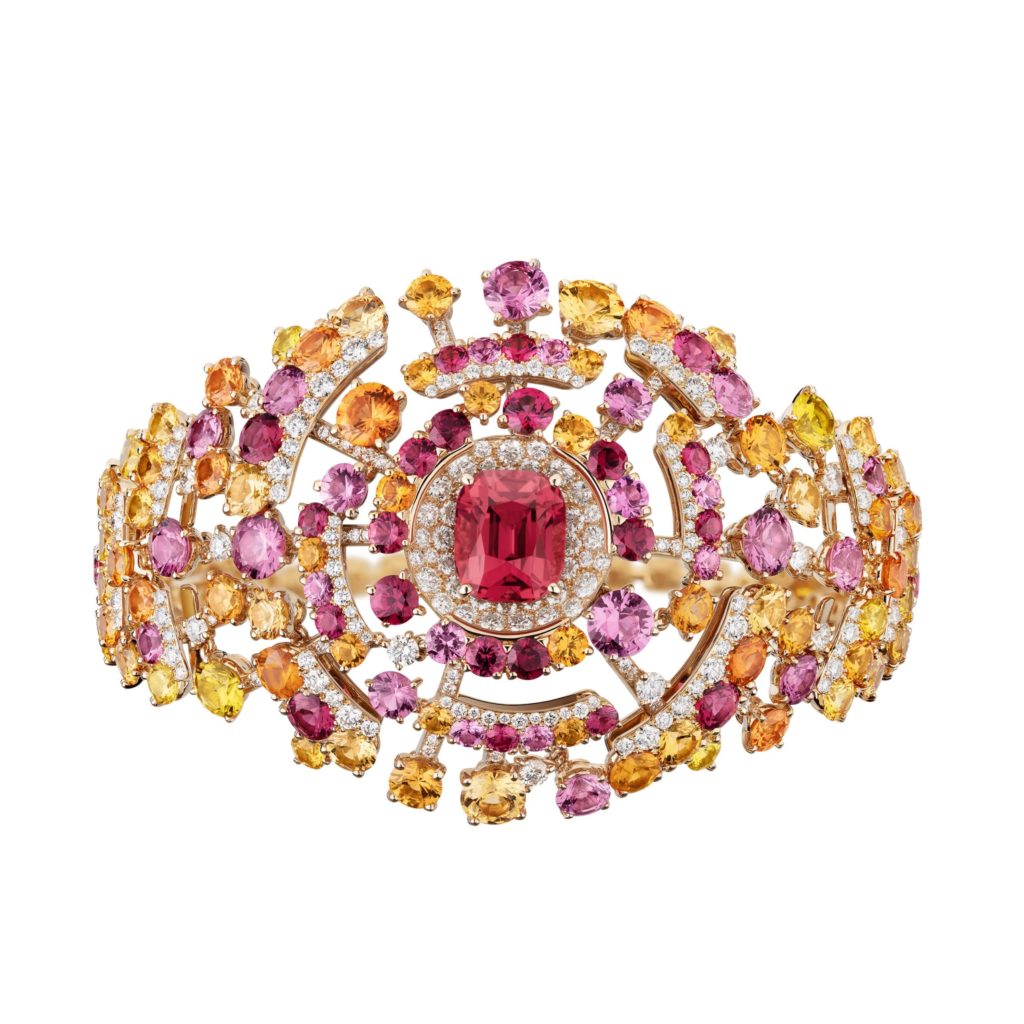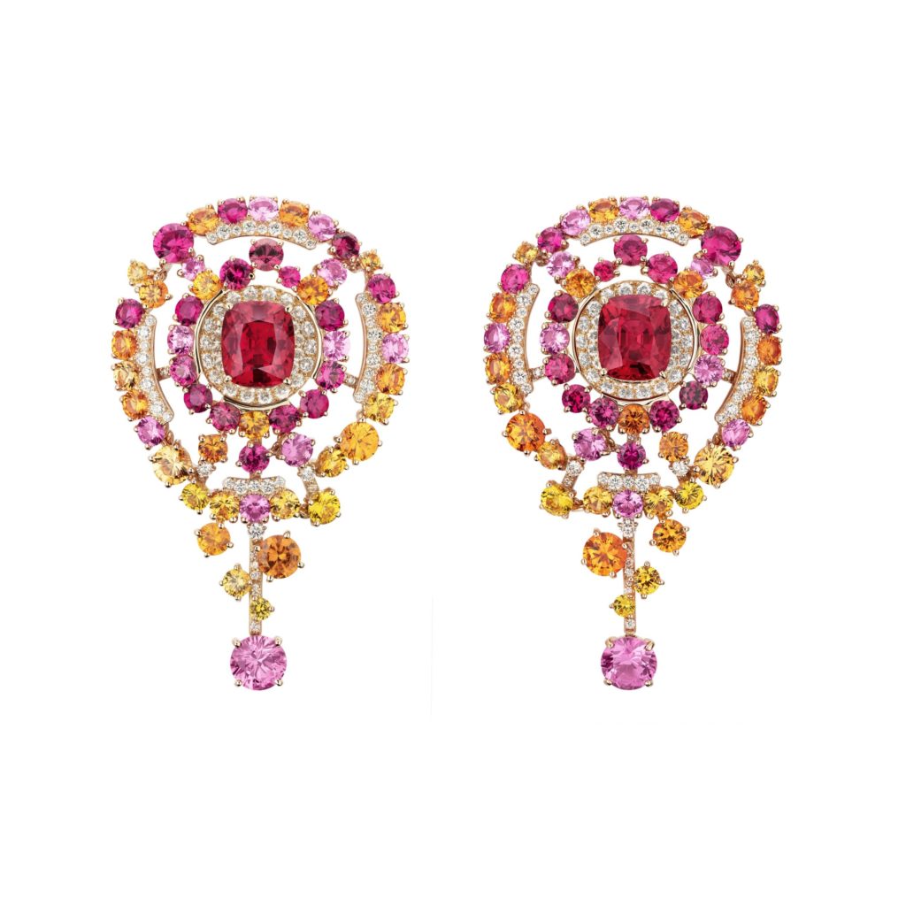 Parure Blushing Sillage en or rose, diamants, grenats, spinelles, rubis, saphirs roses et jaunes. Les centres sont des spinelles pesant respectivement 4,39 ct, 6,24 ct et 4,26 ct. Photos: Chanel Joaillerie