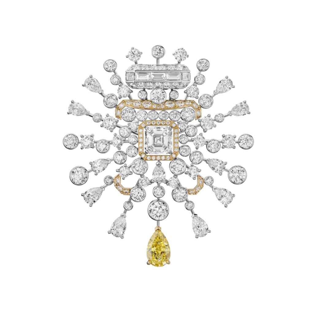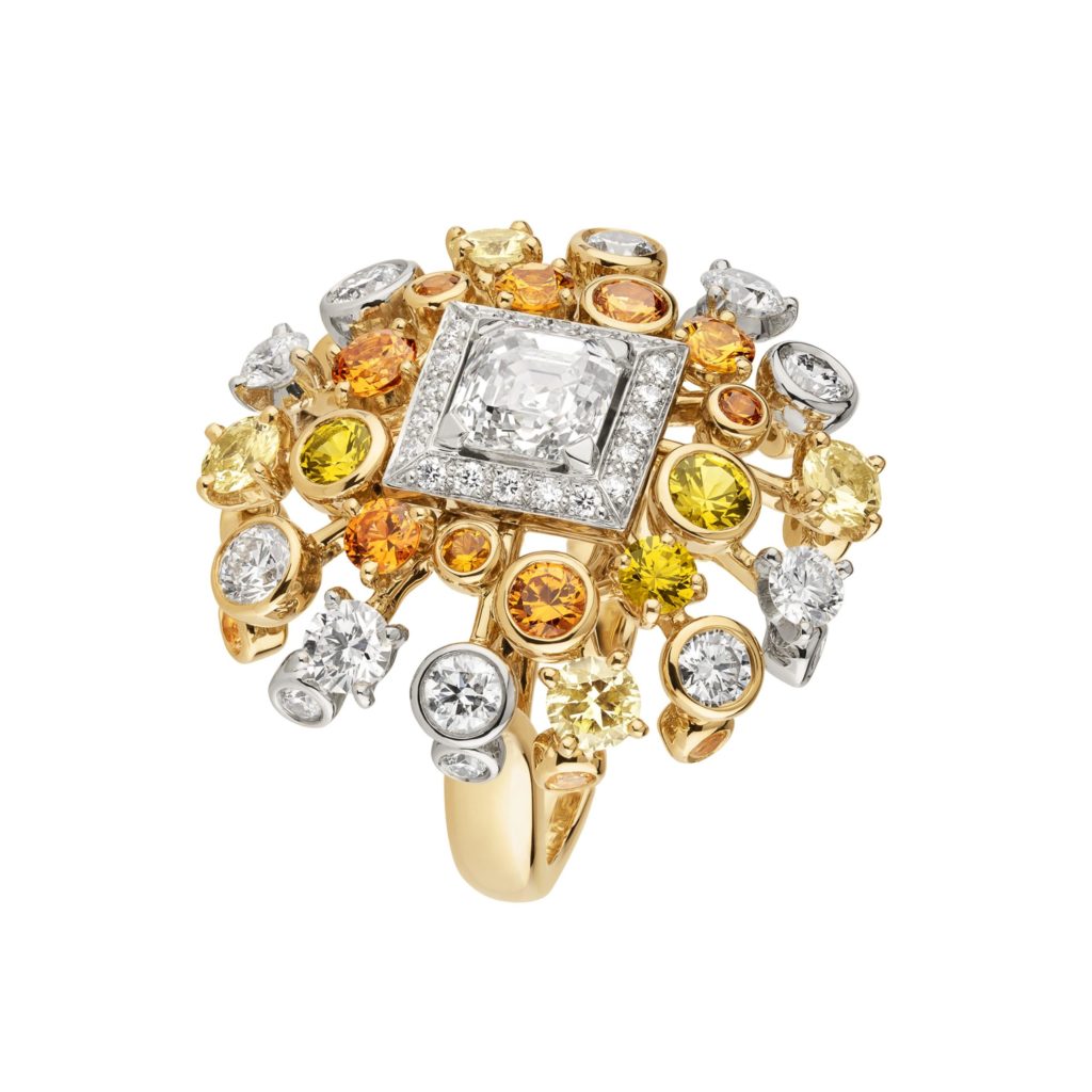 Bracelet, broche et bague Golden Sillange en or jaune et blanc, diamants donc respectivement 1 diamant taille émeraude 3,09 cts D IF, 1 diamant taille asscher 3,19 cts D VVS2.1 diamant jaune taille poire 3,07 cts FVY VS2 et 1 diamant taille asscher 1,53 ct F VVS1. Photos : Chanel Joaillerie