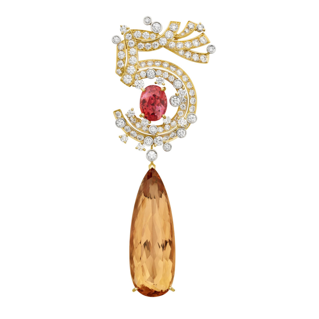 Broche RIBBONED N°5 en or jaune, platine, diamants, topaze impériale et saphir orange. 1 topaze impériale taille poire 30,97 cts. 1 saphir orange taille ovale 4,09 cts. Photo: Chanel Joaillerie