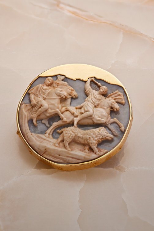 Différents camés et intailles visibles dans l’exposition. (1) Attribué à Dioscoride, début du Ier siècle ap. J.-C. L’empereur Auguste. Intaille en rubis. Collection Guy Ladrière. (2) Egypte, IIe siècle av. J.-C. Cléopâtre Ire. Camée en sardonyx sur une bague moderne en or. Collection Guy Ladrière. (3) Italie, fin du XVe siècle. Chasse au sanglier, d’après l’antique. Camée en sardonyx monté en enseigne. Collection Guy Ladrière. Photos : l’École des Arts Joailliers