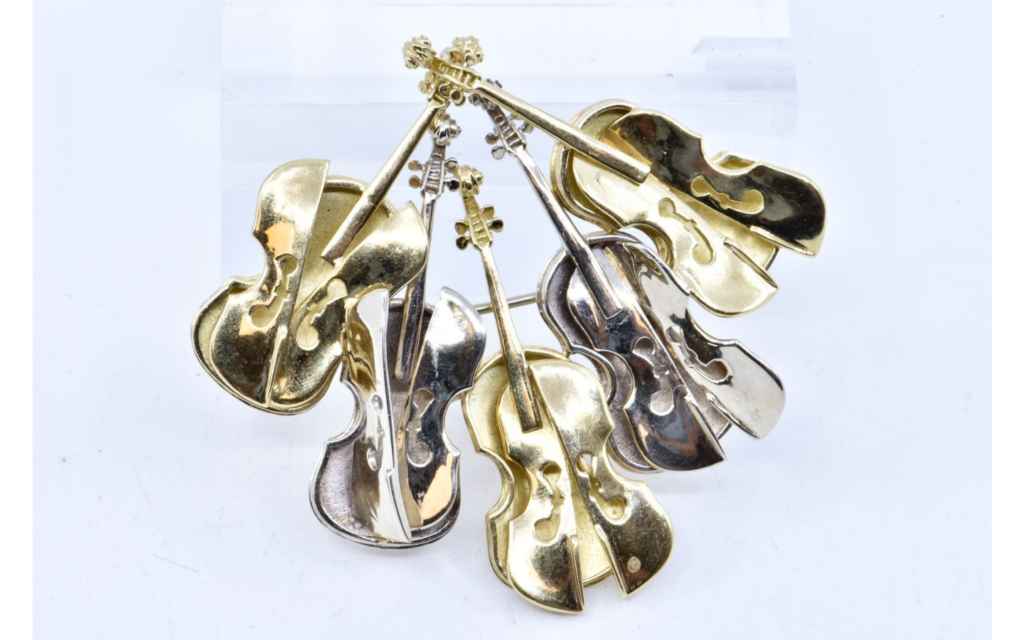 Le lot 293 est une broche signée de Arman « Colère de Violons en or jaune et or blanc. Estimation entre 2000 et 2500 euros. Photo : Douanes