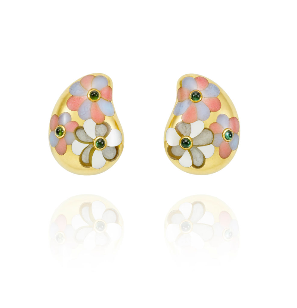 Les boucles d’oreilles en coquillages signée MAZ ne sont pas rares dans les ventes aux enchères. Mais elles ont une allure particulières. MAZ, c’est la MAZZA Company, une entreprise de bijouterie fondée en 1840 en Italie à Torre del Greco, la ville du corail. Au début du XXe siècle, la famille s’installe aux États-Unis et travaille avec les maisons américaines. Il faut attendre les années 1970 pour qu’elle commence à produire ses propres collections. Et plus particulièrement la collection Grotto qui abrite les fameuses boucles d’oreilles avec des coquillages aussi colorés que variés. Estimation entre 1200 et 1500 dollars.
