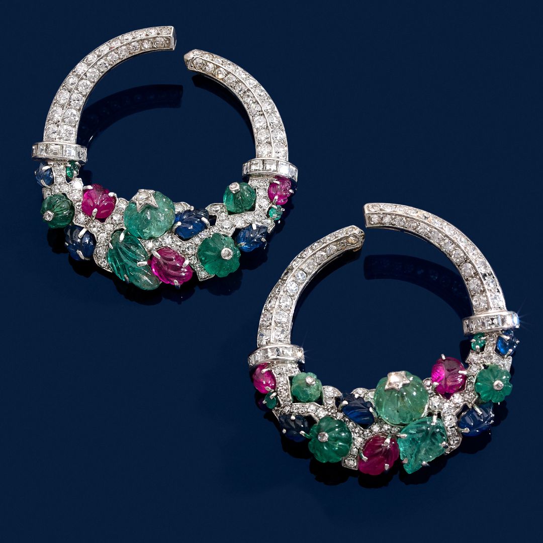 Remarquablement portées par Suzanne sur la photo qui accompagne ces bijoux, cette paire de boucles d’oreilles Tutti Frutti est représentative d’une époque où l’imaginaire des maharajas et de l’Inde légendaire ont donné naissance à des pièces de joaillerie fabuleuses. En 1901, Alexandra du Danemark commande à la maison Cartier un collier pour aller avec des robes indiennes offertes par Mary Curzon, épouse du vice-roi d’Inde.