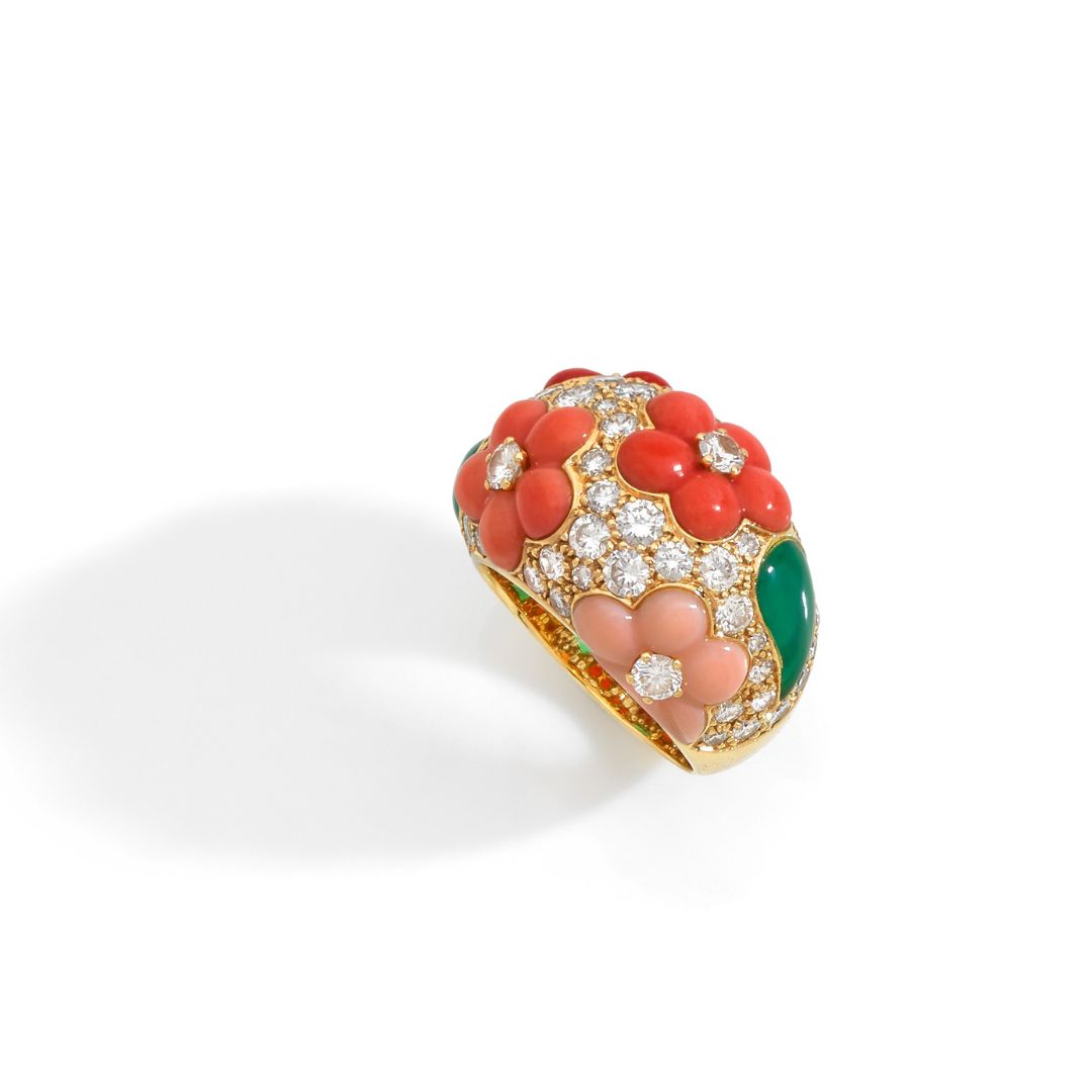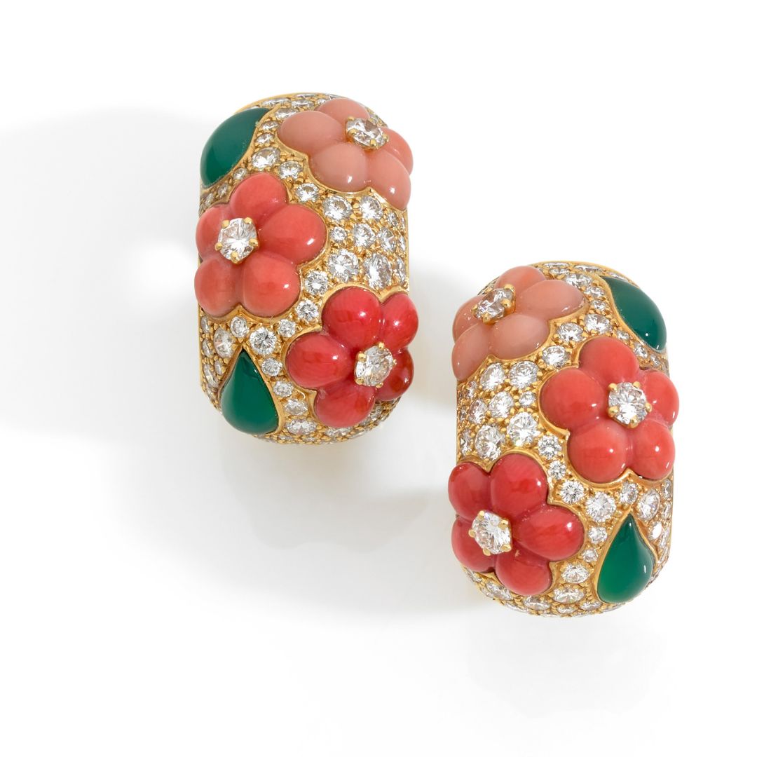 Lots 23 et 24 : bague et boucles d’oreilles signée et poinçonnée de la maison Van Cleef & Arpels, cira 1970s. Or, corail, chrysoprase et diamants. Estimation respective entre 3500 et 5000 pour la bague et 5000-8000 euros pour les boucles d’oreilles. Photos : Osenat