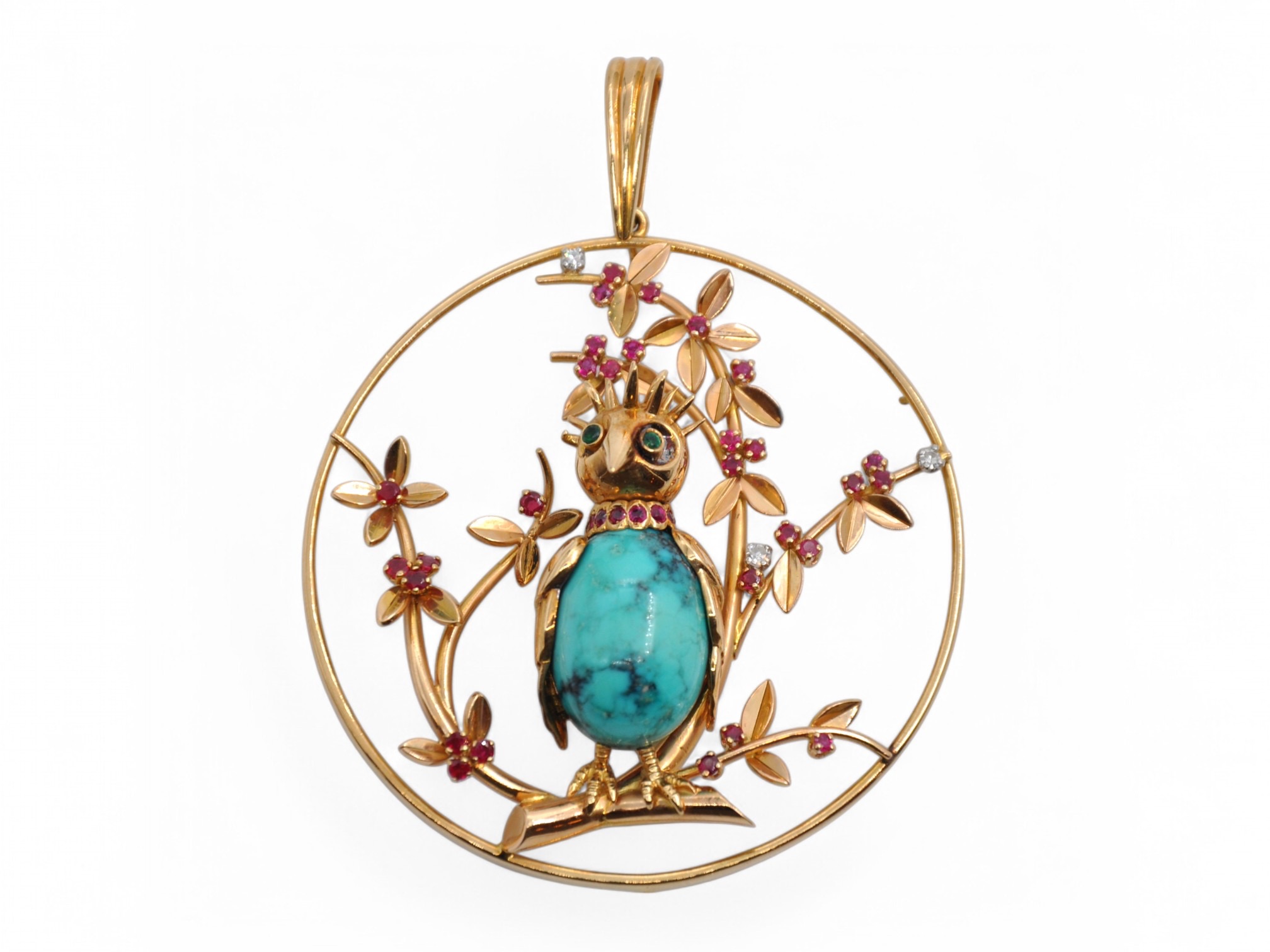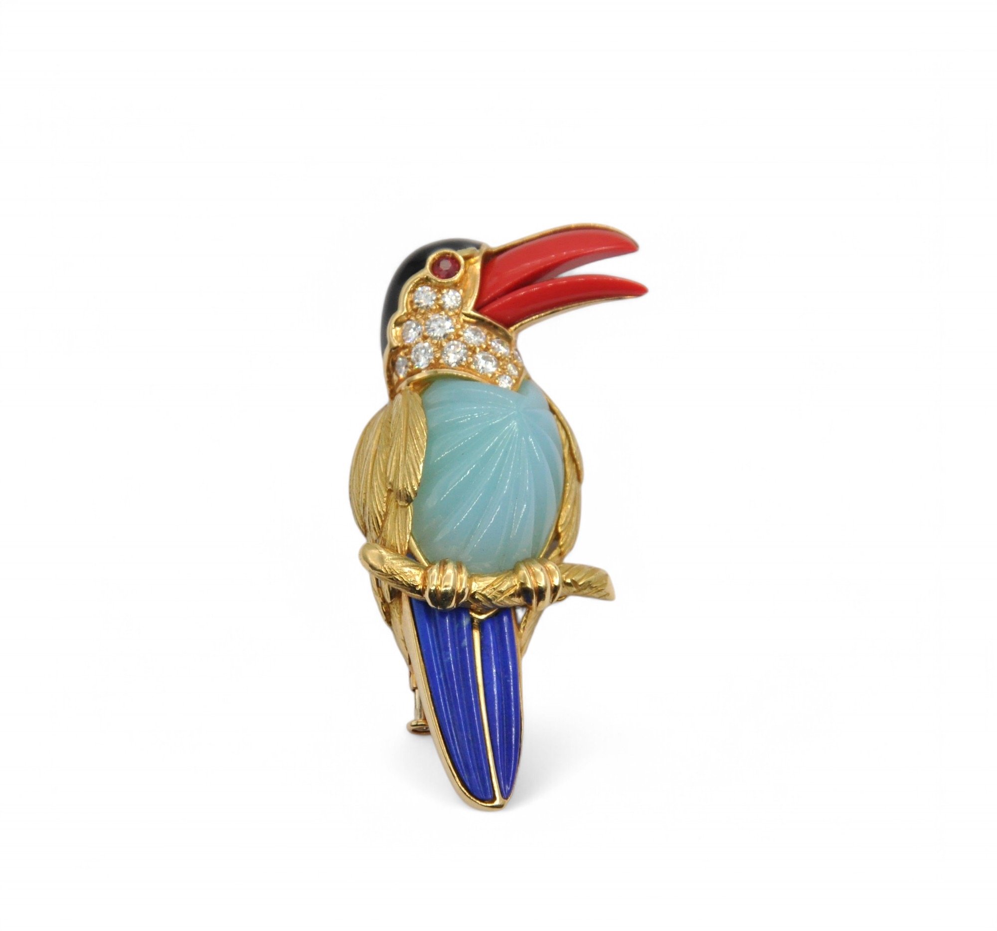 plumage pavé d’une centaine de diamants ronds taille brillant, les yeux ornés d’émeraudes, le bec en corail.