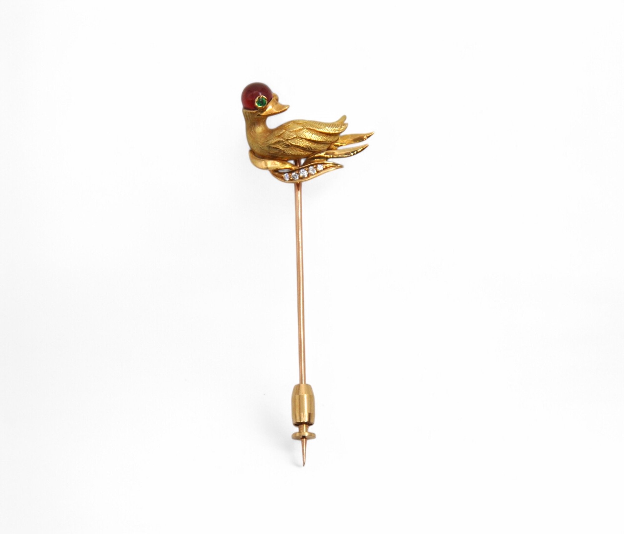 Épingle en or jaune 18K (750/1000) figurant un canard partiellement orné de diamants ronds taille brillant, la tête ornée d’un cabochon rouge,