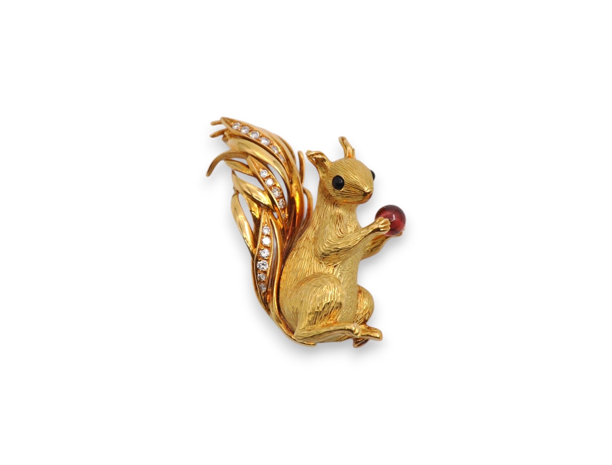 Broche en or jaune 18K (750/1000) figurant un écureuil, la queue partiellement pavée de diamants ronds taille brillant, tenant dans les pattes une sphère, les yeux sertis de cabochons d’onyx. Tige de la broche et fermoir à réparer. Dimensions : 4 cm X 2,5 cm environ. Estimation entre 1500 et 1600 euros. Photo : MS Enchères.