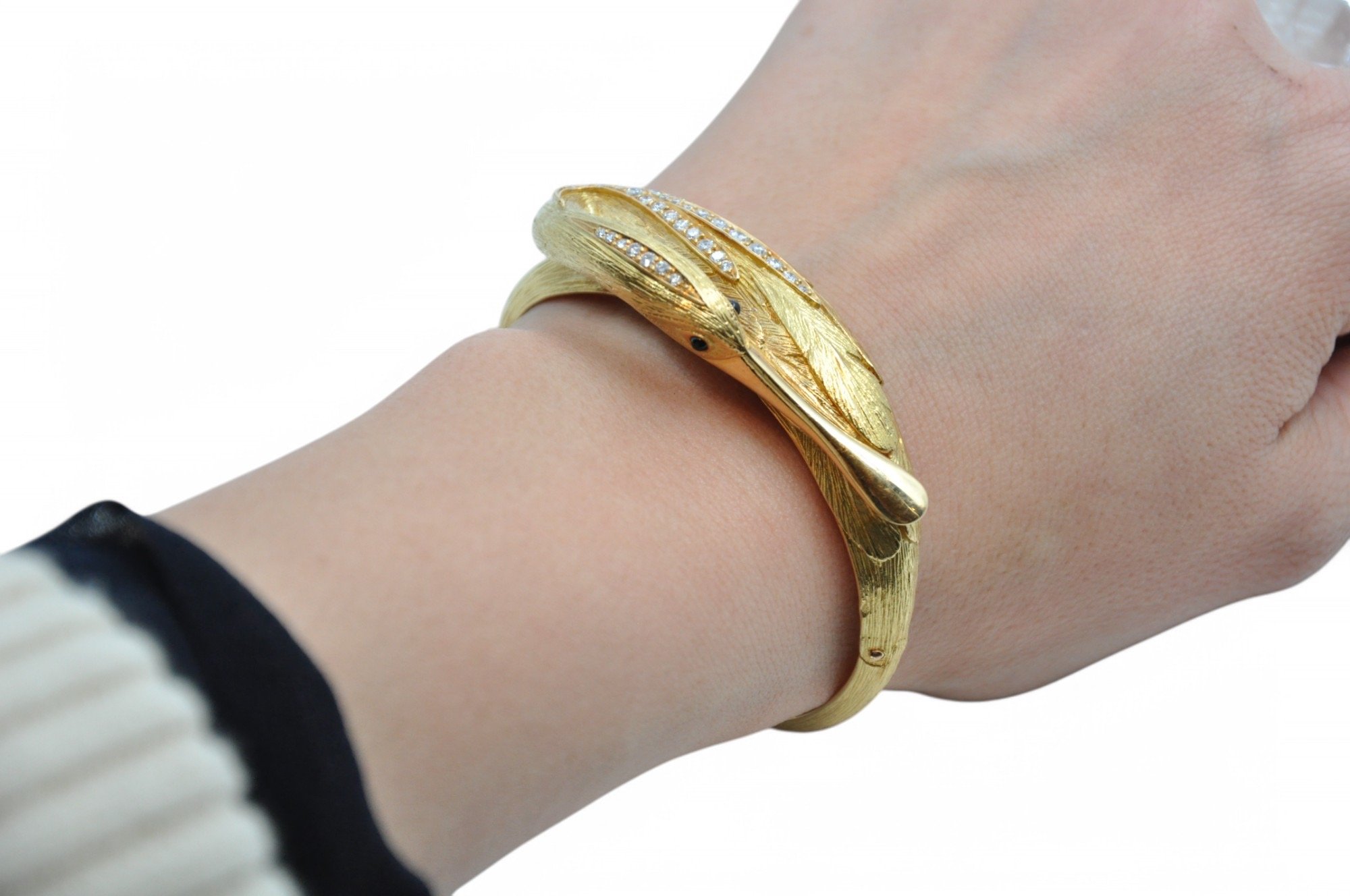 Bracelet jonc articulé en 2 parties en or jaune 18K (750/1000) à décors de canard, le plumage partiellement pavé d’une quarantaine de