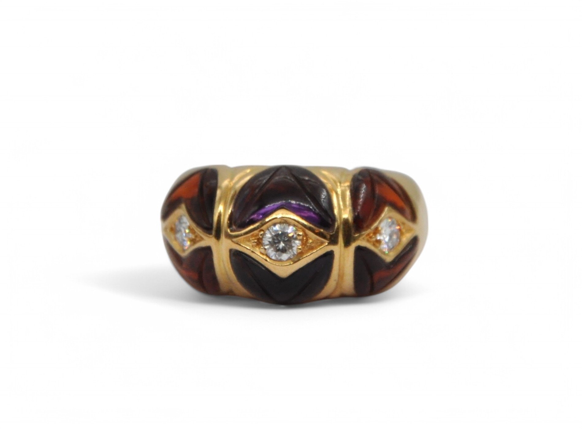 Bague en or jaune 18K (750/1000) bombée, ornée d’améthystes et citrines gravées, encadrant trois diamants d’environ 0,1 carat chacun. Estimation entre 900 et 1100 euros. Photo : MS Enchères