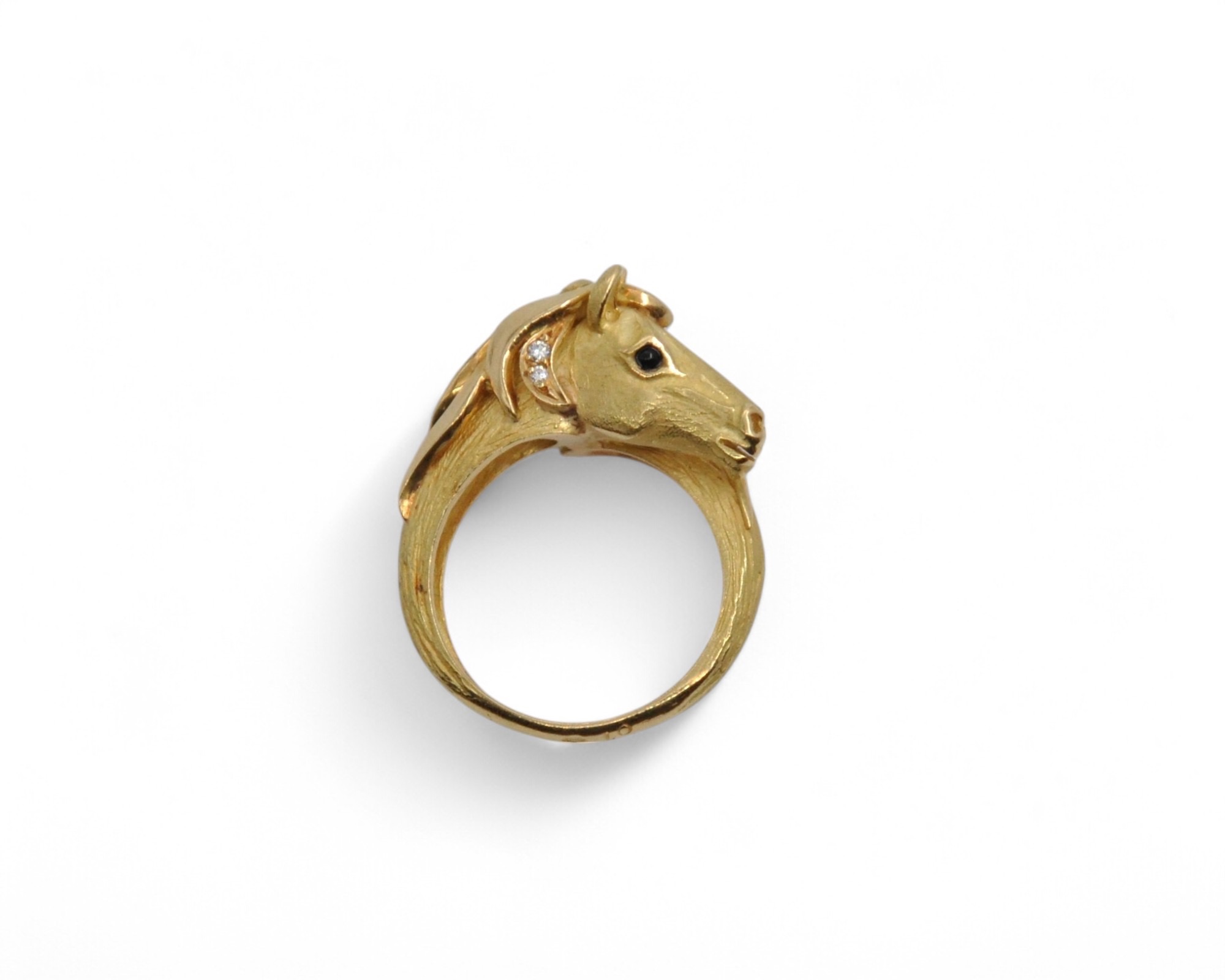 Bague en or jaune 18K (750/1000), figurant une tête de cheval, la crinière partiellement pavée de diamants ronds taille brillant, et les yeux ornés de cabochon d’onyx. Estimation entre 500 et 600 euros. Photo : MS Enchères