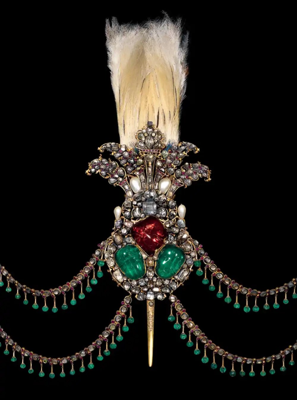 XVIIIe siècle. Ornée de deux grandes émeraudes, d’un rubis imposant et entourée de nombreux petits diamants et perles, cette aigrette du trésor du palais de Topkapı est d’une somptuosité extrême. Les quatre chaînes pendantes, serties de diamants et de perles et évoquant le scintillement des plumes, rehaussent encore sa magnificence. Elle constitue un exemple remarquable d’aigrettes pendantes qualifiées de « Hindkari » dans les documents ottomans. La taille en cabochon des pierres (rubis et émeraudes) témoigne de la persistance, sous certains aspects, des traditions du XVIIe siècle.
