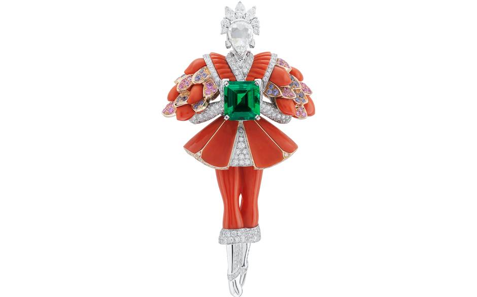 Clip « Prince rouge » (Le mariage) réalisé en or blanc et or rose, diamants, corail rouge, saphirs de couleurs. Le centre de la pièce est une émeraude brésilienne de 2,25 carats. Photo : VCA