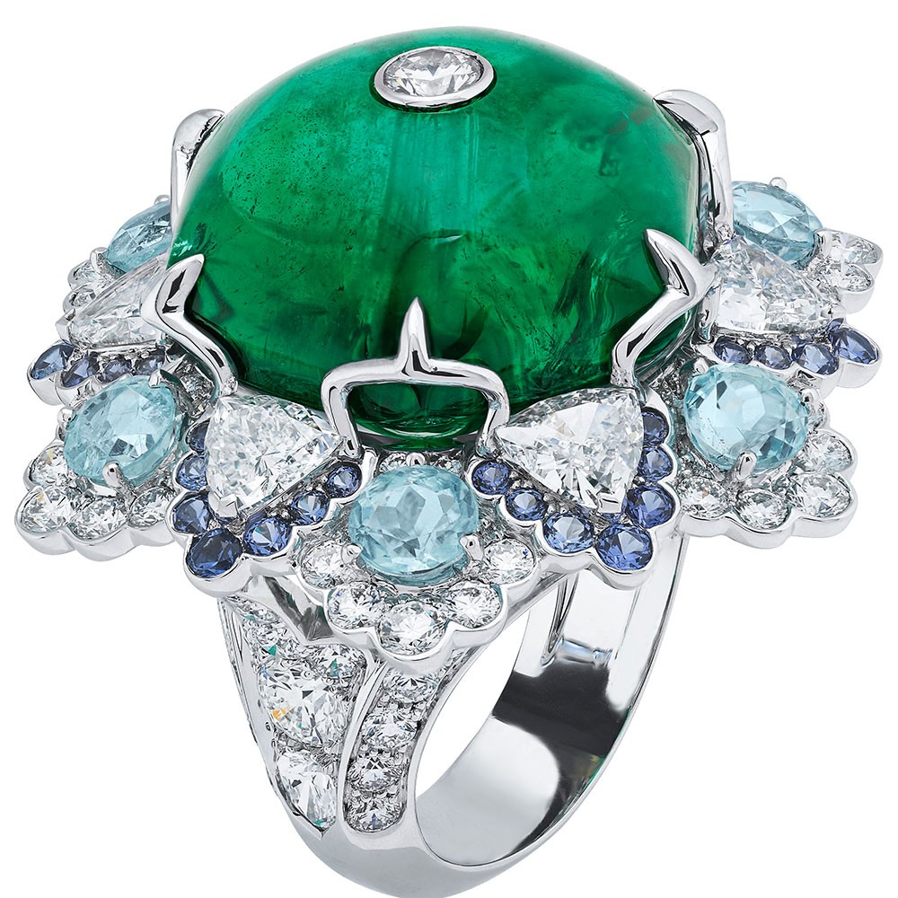 Bague « Amour, amour » réalisée en or blanc, diamants, tourmalines, spinelles pourpres. le centre de la pièce est un cabochon d’émeraude (provenance : Zambie) de 28,06 carats. Photo : VCA