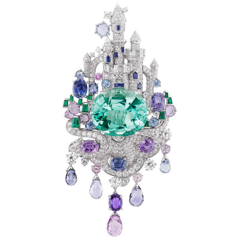 Clip « Château enchanté » (L’enfance) réalisé en or blanc, diamants, saphirs de couleurs, émeraudes dont la pierre centrale. Celle-ci d’origine brésilienne pèse 39,85 carats. Photo : VCA